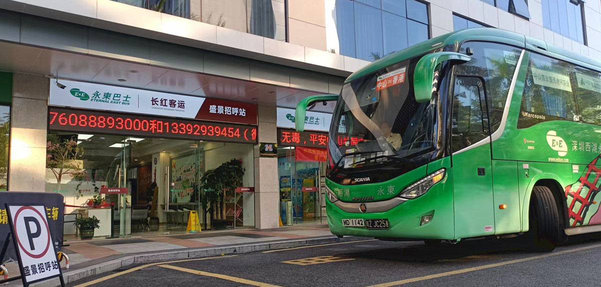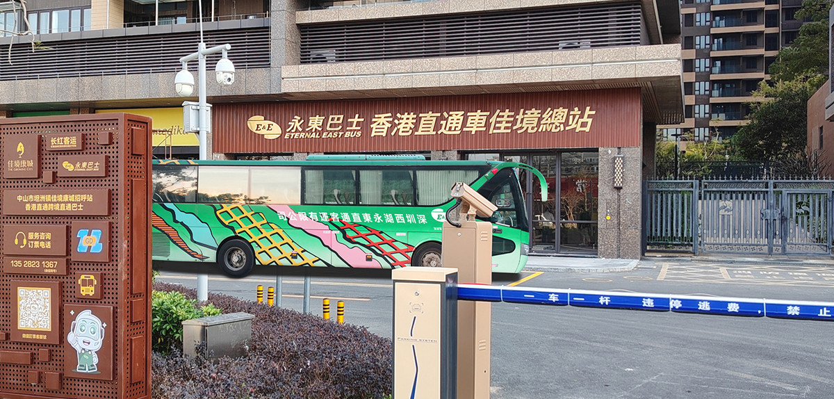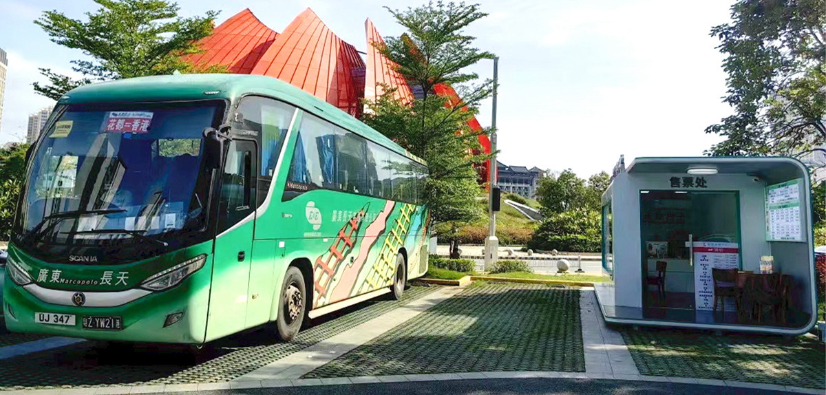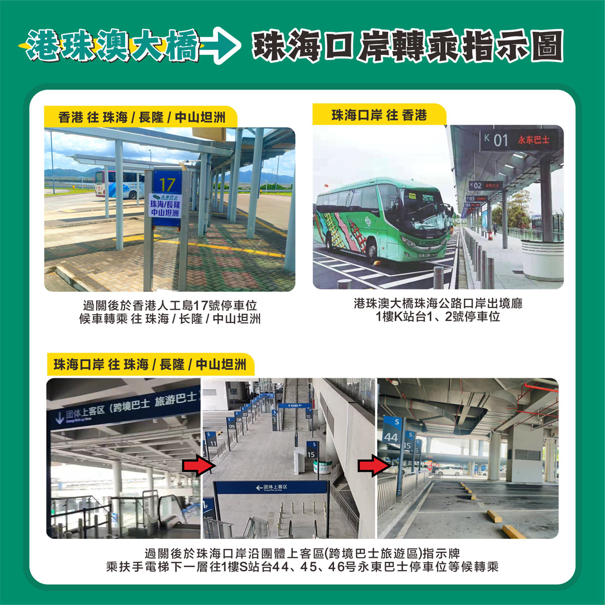 珠海口岸往珠海/長隆/中山坦洲:過關後於珠海口岸沿團體上客區(跨境巴士旅遊區)指示牌乘扶手電梯下一層往1樓S站台44、45、46號停車位