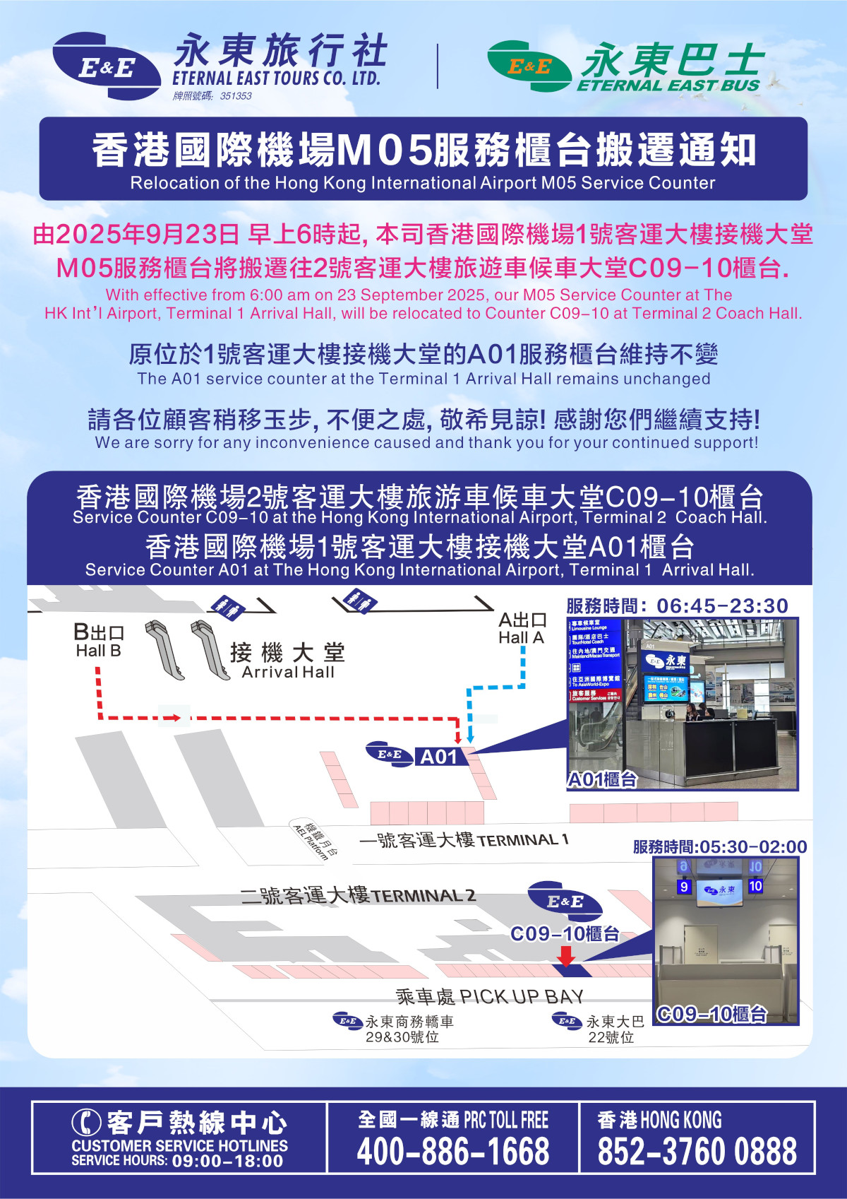本司香港國際機場一號客運大樓 M05 服務櫃台將搬遷往