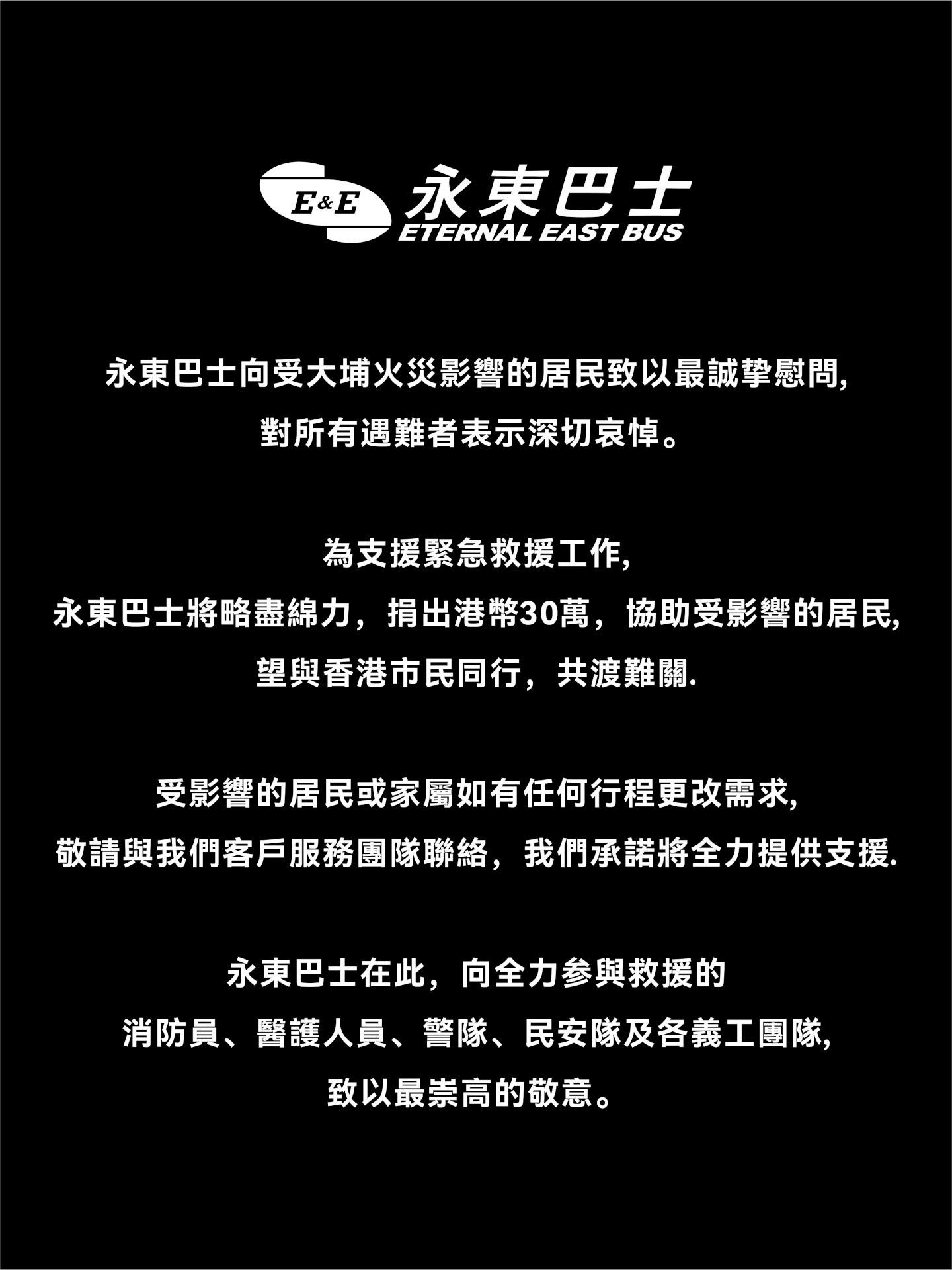 永東巴士向受大埔火災影響的居民致以最誠摯慰問, 對所有遇難者表示深切哀悼