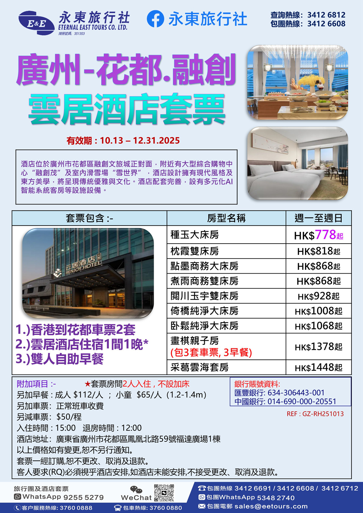 廣州 - 花都.融創雲居酒店套票(客房+往返車票)