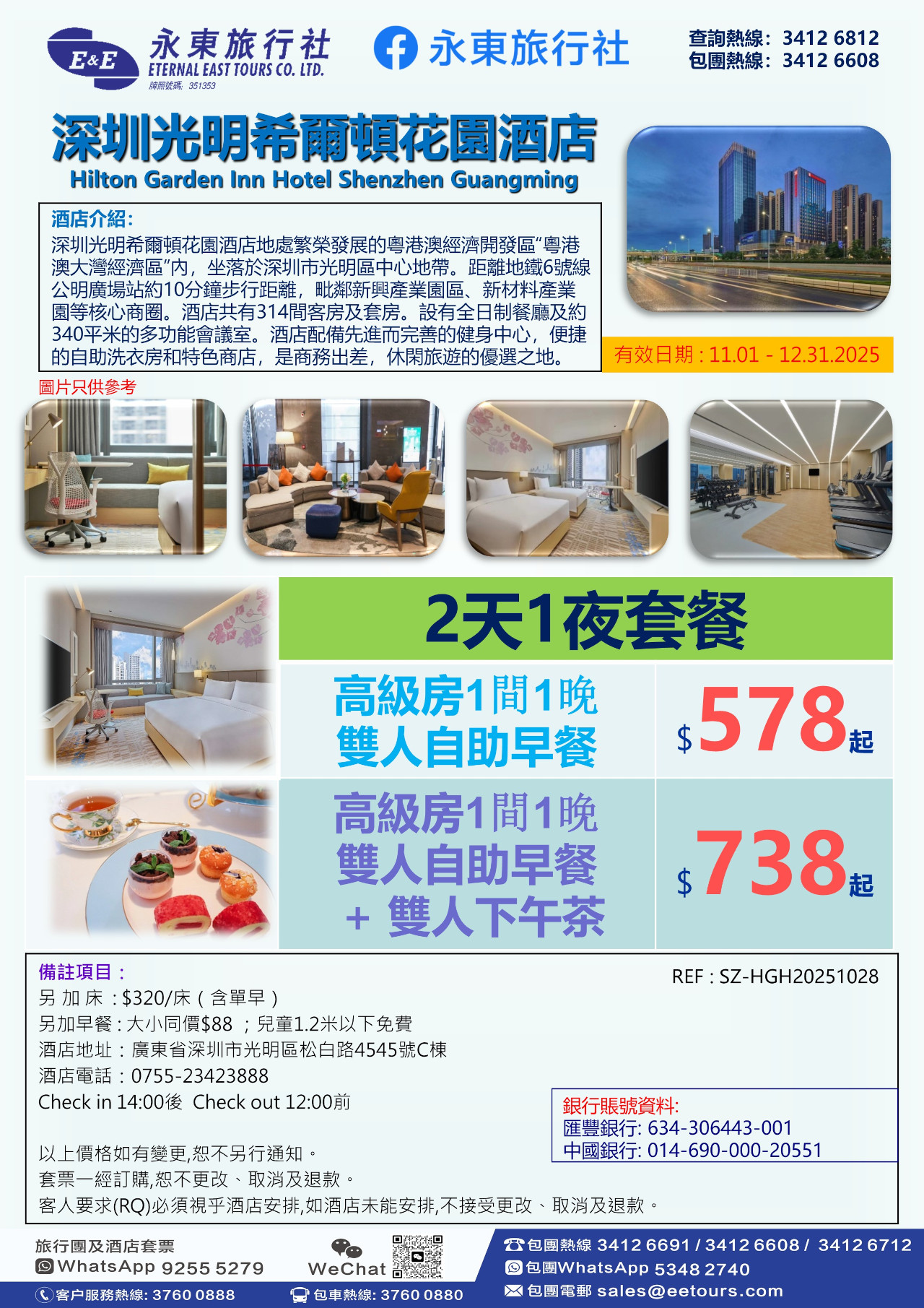 深圳 - 光明希爾頓花園酒店(客房+雙早+下午茶)