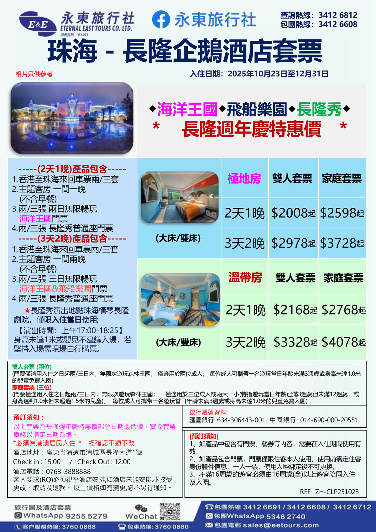 (週年慶特惠) 珠海 - 長隆企鵝酒店套票3天2晚家庭(客房+飛船樂園+海洋王國+長隆秀+車票)