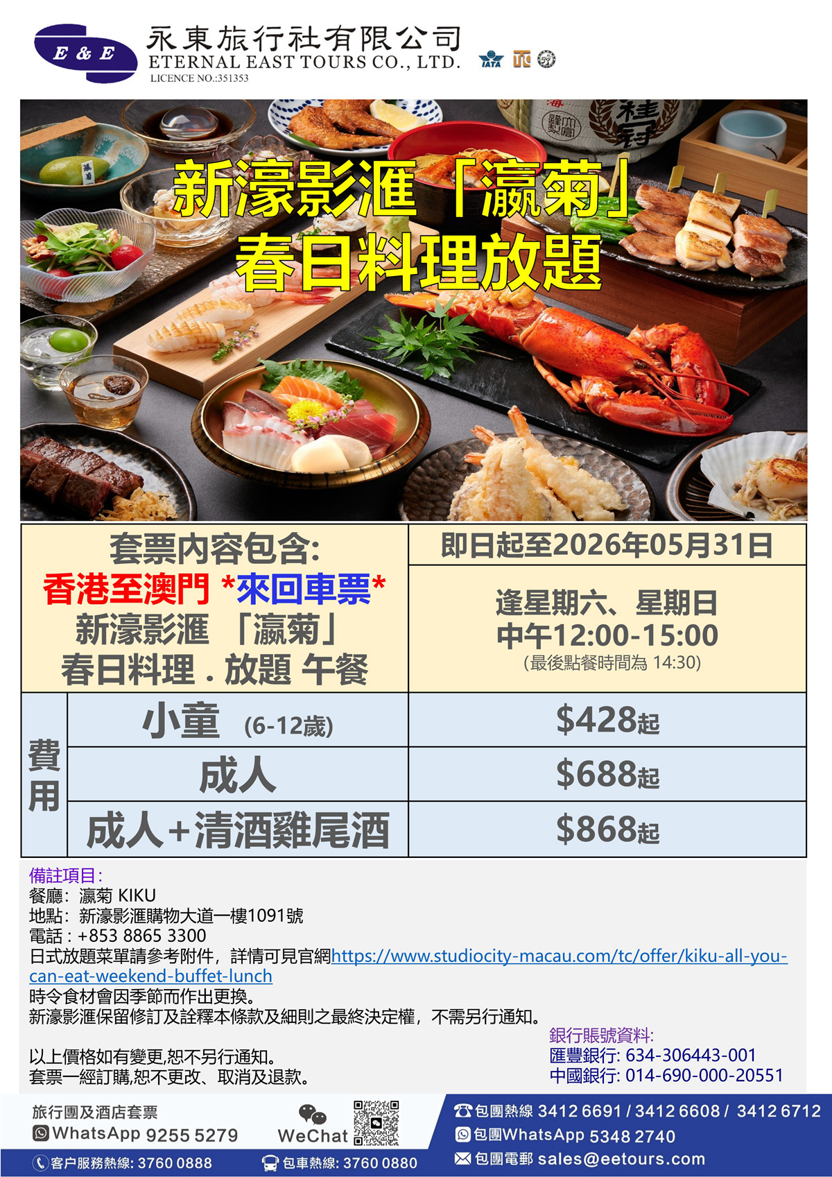 日式放題菜單請參考附件,詳情可見官網https://www.studiocity-macau.com/tc/offer/kiku-all-you-can-eat-weekend-buffet-lunch