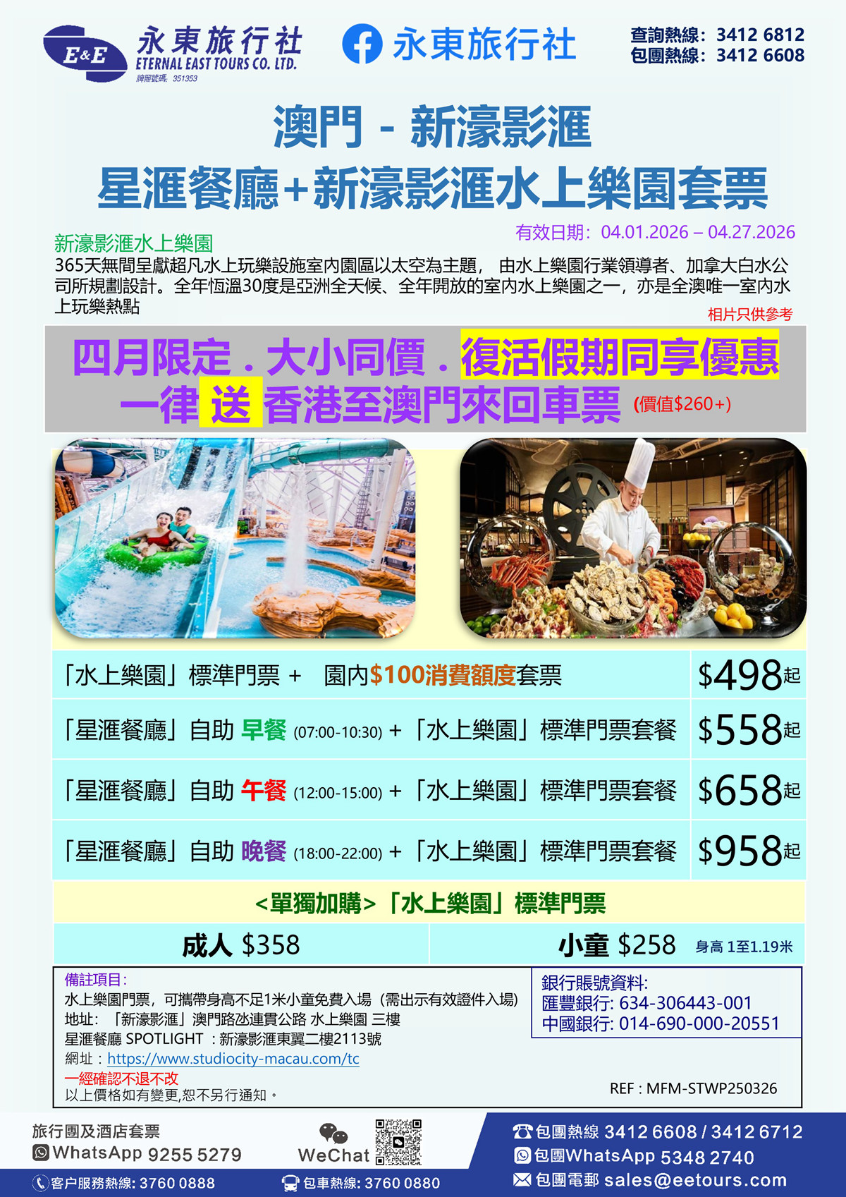 四月限定. 「星滙餐廳」自助早餐 +「水上樂園」門票套餐 送 香港至澳門來回車票