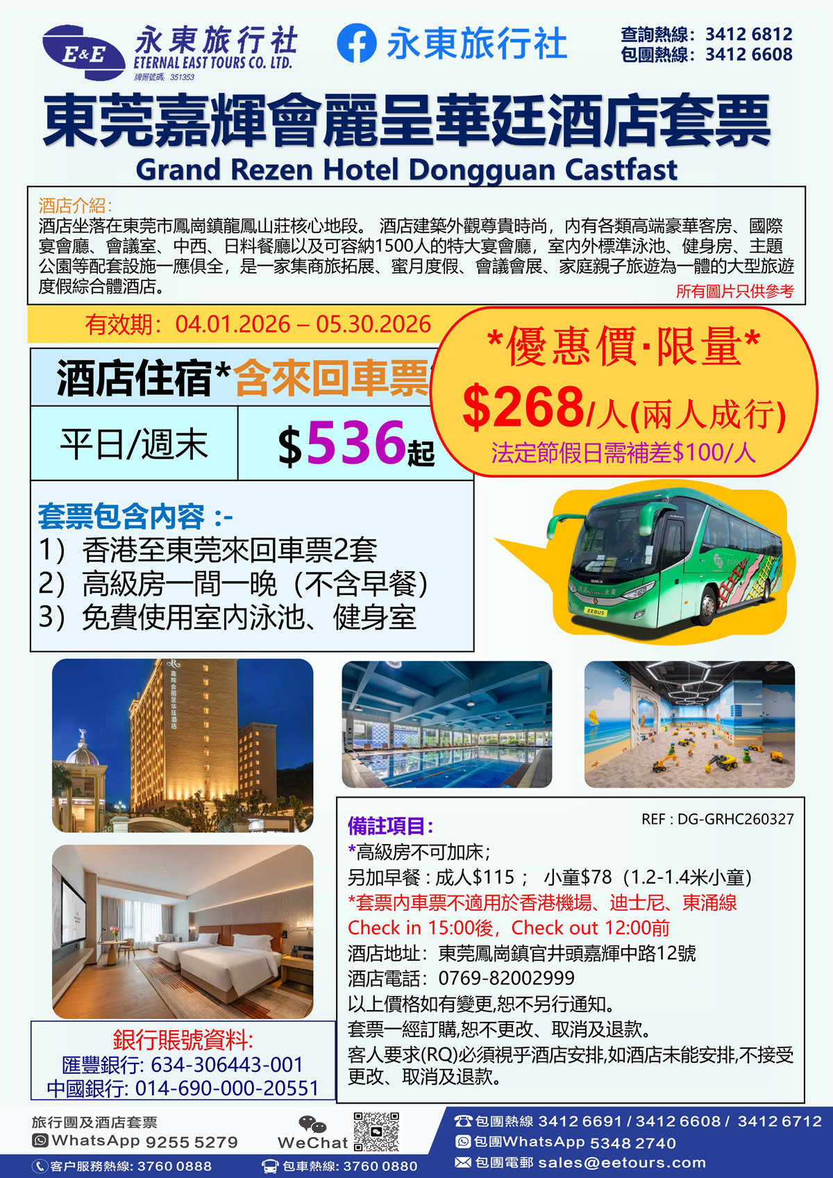 限量優惠價|東莞嘉輝會麗呈華廷酒店套票(含來回車票)