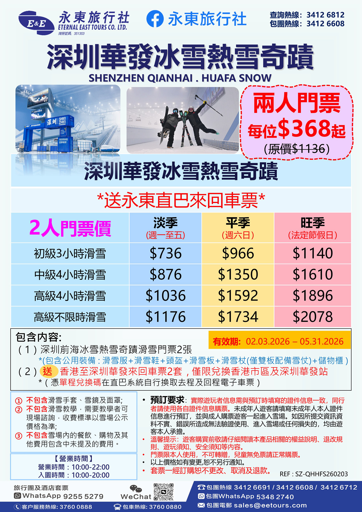 !(雙人滑雪票)深圳華發冰雪熱雪奇蹟滑雪場門票(中級4小時滑雪票)送車票